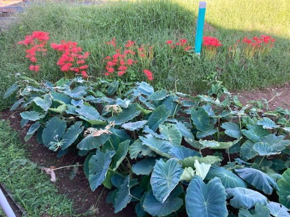 今年の厳しい暑さのせいで、手前の里芋の葉は哀れな姿ですが、