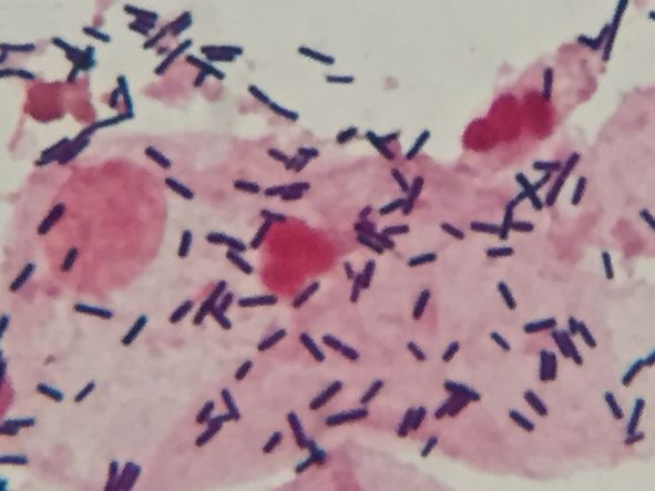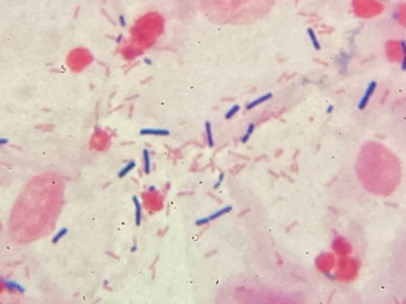 グラム染色という特殊な染色をして観察すると、濃紺に染まる(グラム陽性)細長い菌(桿菌)がたくさん見えます。。これが腟内フローラの主役(乳酸桿菌)です。