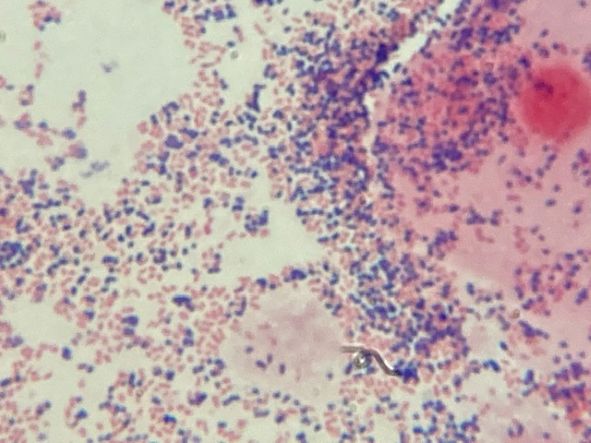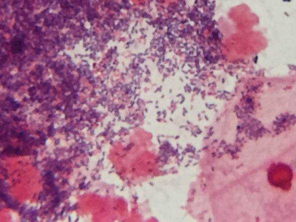 グラム染色した標本で観察すると、細かく(短桿菌)青く染まる(グラム陽性)菌と赤く染まる(グラム陰性)菌が見られます。これこそが(悪玉菌といわれる)腟ガルドネラ菌です。腟内フローラが乱れると腟内はこのように劇的変化を示し、典型的な細菌性腟症のケースです。