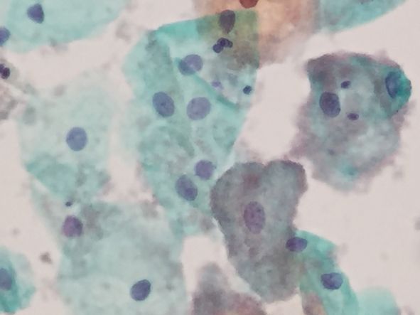 私達が日常の業務(子宮頸がん検診の標本)で見ている細胞はこのように見えます。